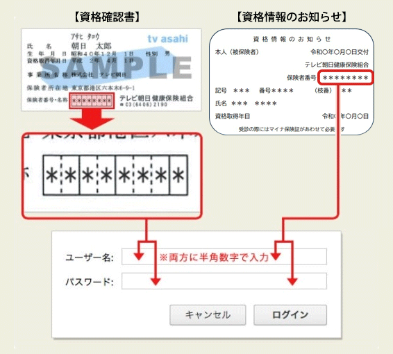 ユーザー名・パスワードは資格情報のお知らせ、資格確認書に記載されている保険者番号(テレビ朝日健康保険組合の8桁の数字)になります。お手許にご用意下さい。